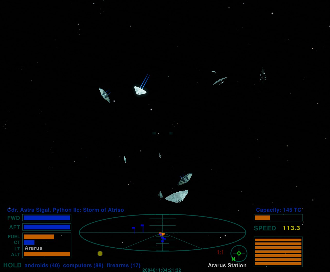 Companion Trader & Python Squeeze: double convoy in transit to Ararus Station. Cdr. Astra Sigal in Python II "Storm of Atriso", aft view. Her 3 Cobra stragglers have rejoined the group...